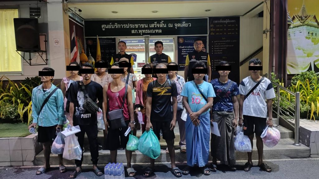 จับกุม 1.MRS.NYU NYU SAN อายุ 31 ปี, 2.MRS.PA PA LIN อายุ 39 ปี, 3.MRS.MAY MYAT THUอายุ 25 ปี, 4.MRS.YU YU NWE อายุ 31 ปี, 5.MRS.MYO MYAT NWE อายุ 31 ปี, 6. MR.AYE WIN อายุ 31 ปี, 7. MR.MYO NAING TUN อายุ 32 ปี, 8.MR.MIN THEIN อายุ 35 ปี, 9. MR.MIN THEIN อายุ 35 ปี 10. MR.THET KYAW MOE อายุ 31 ปี, 11. MR.ZAW WIN MAUNG อายุ 38 ปี, 12. MR.CHIT MIN THU อายุ 24 ปี สัญชาติ เมียนมา โดยกล่าวหาว่า “เป็นคนต่างด้าวเดินทางเข้ามาและอยู่ในราชอาณาจักรโดยไม่ได้รับอนุญาตหรือการอนุญาตสิ้นสุกหรือถูกเพิกถอน” และ 13. MR.MAUNG ZAW อายุ 49 ปี สัญชาติ เมียนมาโดยกล่าวหาว่า “เป็นคนต่างด้าวเดินทางเข้ามาและอยู่ในราชอาณาจักรโดยไม่ได้รับอนุญาต” สถานที่จับกุม เลขที่ 72/4 หมู่ 5 ต.คลองโยง อ.พุทธมณฑล จว.นครปฐมนำตัวส่ง พงส.สภ.สภ.พุทธมณฑล จว.นครปฐม