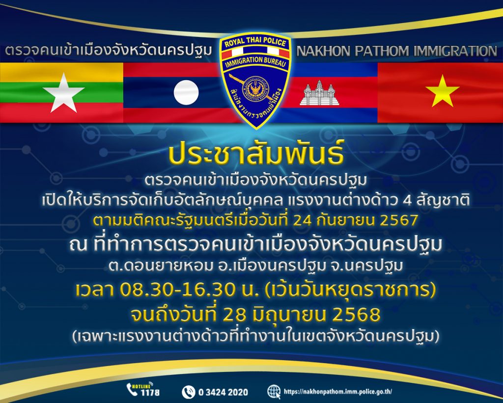 📣 ตรวจคนเข้าเมืองจังหวัดนครปฐม ประชาสัมพันธ์การจัดเก็บข้อมูลอัตลักษณ์บุคคลของแรงงานต่างด้าว 4 สัญชาติ ตามมติ ครม. เมื่อวันที่ 24 ก.ย.67