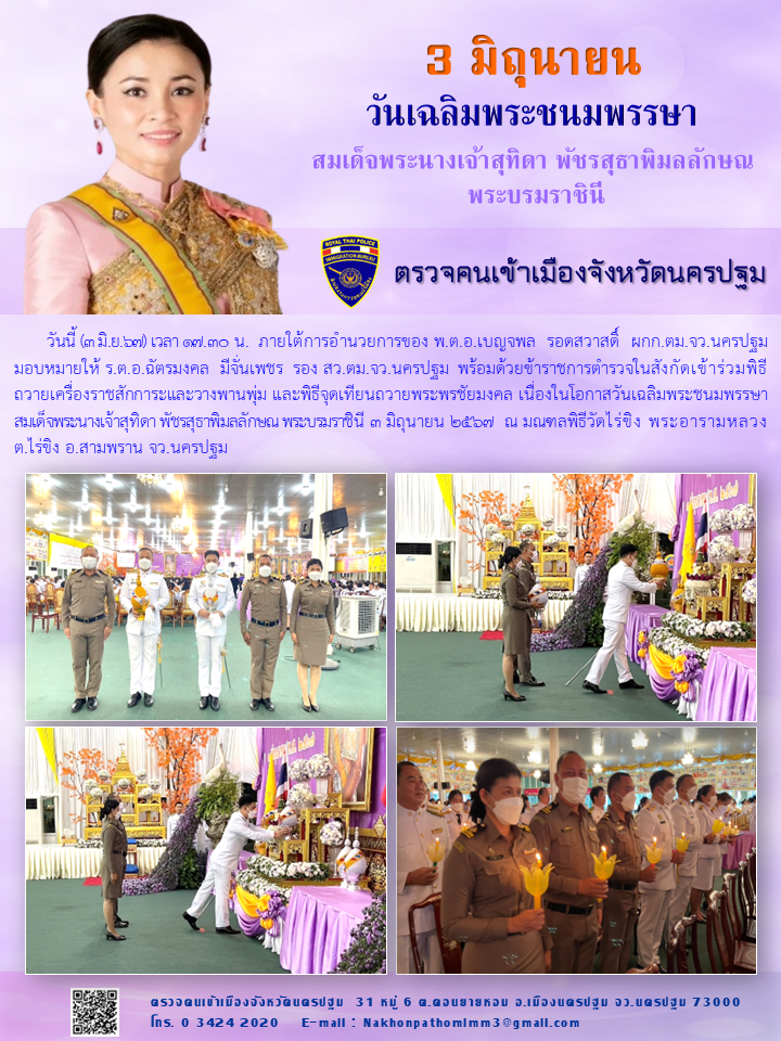 วันที่ 3 มิ.ย.67 เวลา 17.30 น. ภายใต้การอำนวยการของ พ.ต.อ.เบญจพล รอดสวาสดิ์ ผกก.ตม.จว.นครปฐม มอบหมายให้ พ.ต.ท.จิรโชติวัจน์ คล้ายคลึง สว.ตม.จว.นครปฐม พร้อมด้วยข้าราชการตำรวจในสังกัดเข้าร่วม พิธีถวายเครื่องราชสักการะและวางพานพุ่ม และพิธีจุดเทียนถวายพระพรชัยมงคล เนื่องในโอกาสวันเฉลิมพระชนมพรรษา สมเด็จพระนางเจ้าสุทิดา พัชรสุธาพิมลลักษณ พระบรมราชินี 3 มิถุนายน 2567 ณ บริเวณลานหน้าพระร่วงโรจนฤทธิ์ องค์พระปฐมเจดีย์ อ.เมืองนครปฐม จว.นครปฐม
